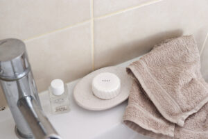 We have our round, pleat-wrapped soaps, which are easy to use and give a traditional style to your bathroom. Alternatively we offer our rectangle, flow-wrapped soaps, these give more of a modern look to your bathroom. And then finally, we offer boxed packaging, which either come in white or recycled, brown boxes. This can add that perfect, rustic addition to your guest bathroom – and is eco-friendly!!